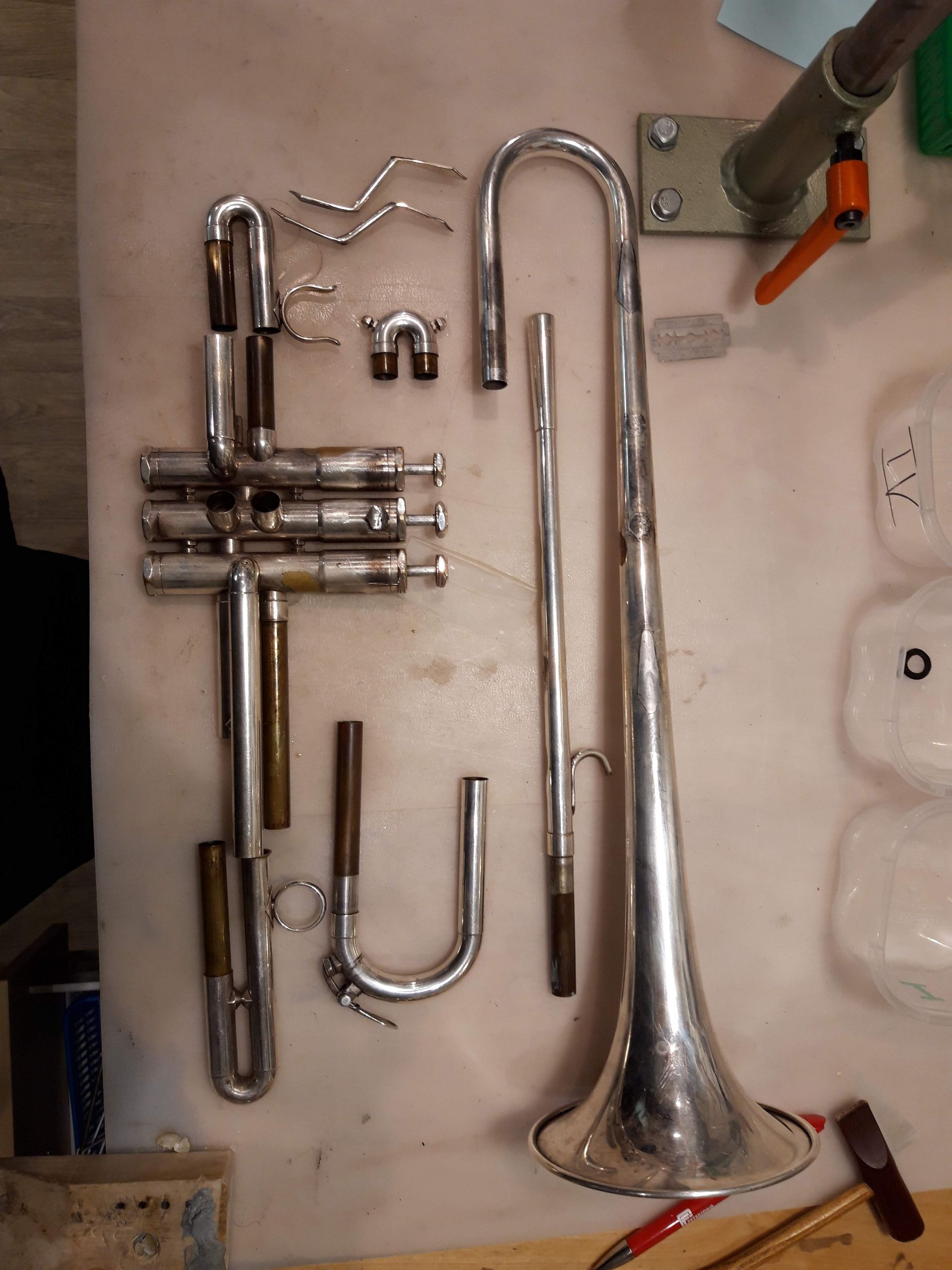 Révision totale, restauration: démontage complet, débosselage, jeux mécanique, nettoyage, polissage/traitement du bois, changement feutres et lièges et de tous les tampons, lubrification, fabrication ou remplacement pièces endommagées, réglage complet.